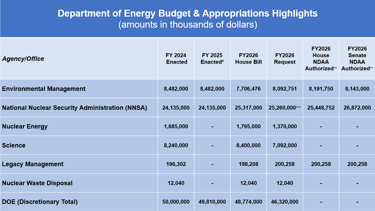 The ECA Budget Tracker monitors appropriations for DOE and its Offices under the Energy and Water appropriations, as well as the National Defense Authorization Act (NDAA). This page will help you identify when each bill advances, provide links to the bill texts and reports, and more about the appropriations process.