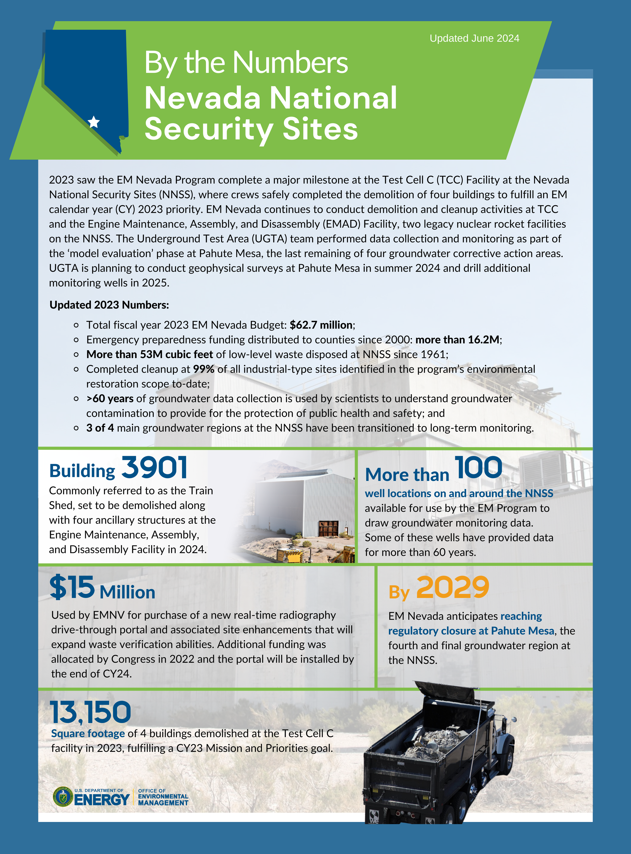 Over the coming decade, the EM Nevada program expects to complete its current scope of cleanup activities safely, securely, and successfully at the NNSS. EM Nevada will continue to closely collaborate with local stakeholders, including the Nevada Site Specific Advisory Board (NSSAB), Intergovernmental Liaisons group, Low Level Waste Stakeholders Forum, and others, to to complete it’s cleanup in a manner that prioritizes the protection of people, communities, and the environment.